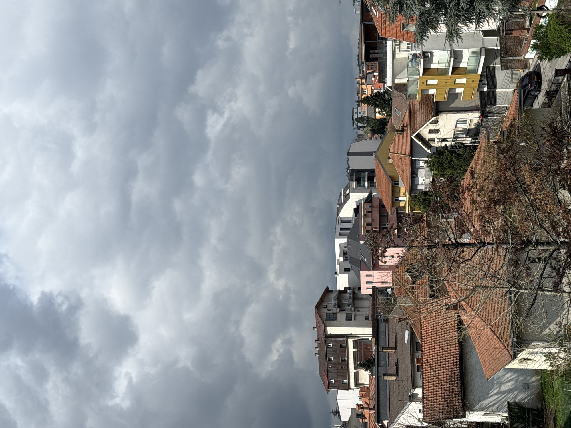 view of a residential area in Vozdovac Urban Municipality, Serbia, under a cloudy sky. Several houses and apartment buildings with red tile roofs and light-colored facades are visible, interspersed with trees. A dark-colored car is parked on a street. The architecture appears to be a mix of older and newer styles. The sky occupies a significant portion of the frame, indicating potentially inclement weather.