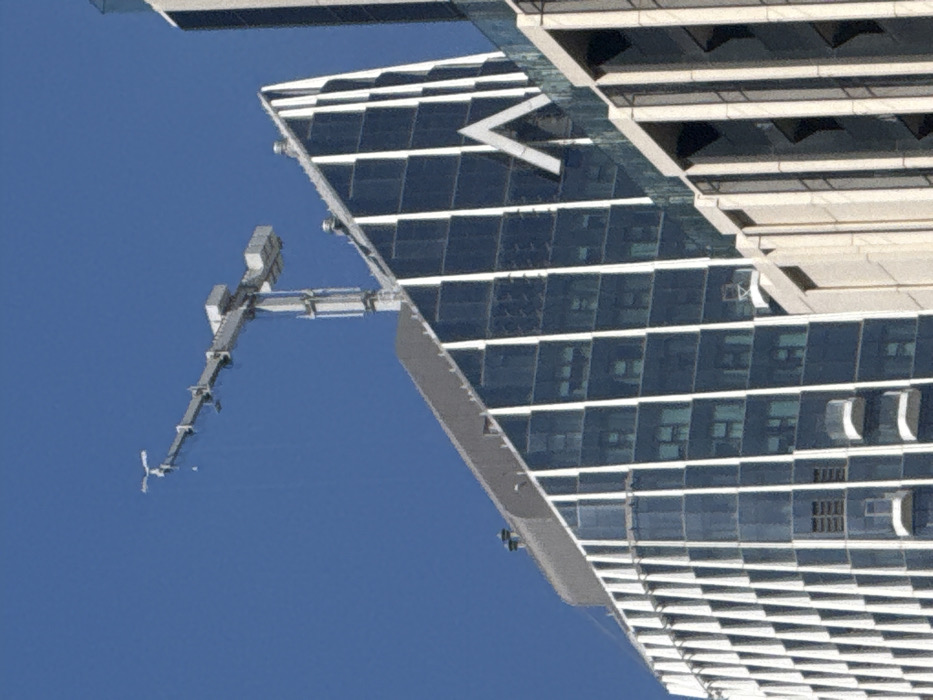A modern skyscraper with a geometric facade is viewed from below, the building's sharp angles cutting across a clear blue sky. A mechanical arm extends from the building's edge, possibly for window cleaning or maintenance. The architecture features reflective glass panels arranged in a grid-like pattern. A large "V" shape is prominently visible on the building's upper surface. The overall impression is one of sleek, contemporary design.