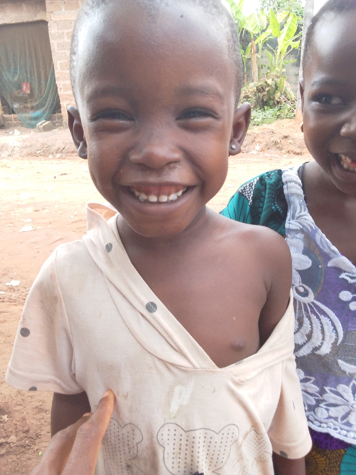 A young child with dark skin, short hair, and a bright smile faces the camera