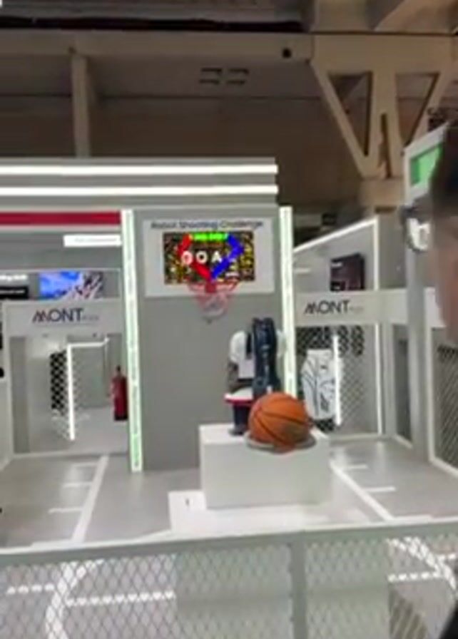 A person walks in front of a basketball game booth. The booth has a robot that is throwing a basketball. The robot successfully throws the basketball into a hoop. A woman is walking past the booth. The booth is in a large, open convention center.