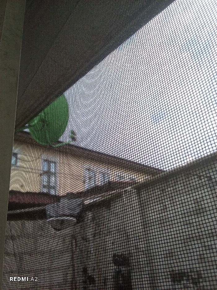 The image displays an exterior view through a dark, fine mesh screen, likely from a window, situated in Elelenwo, Nigeria. A dark grey vertical frame element is visible on the left, with a corresponding horizontal element across the top. Beyond the screen, a light-colored, multi-story building with several rectangular windows and a reddish-brown sloped roof is present in the middle ground. A bright green object, possibly a plastic container, is partially visible above the building's roofline on the upper left. Below the building, a dark, corrugated structure is visible. To the right of the building, a light grey concrete or block wall, exhibiting texture and dark staining, occupies the lower right quadrant. The sky, appearing bright and overcast, is visible through the screen above the structures. No individuals or overt actions are depicted. A "REDMI A2" watermark is present in the lower-left corner.