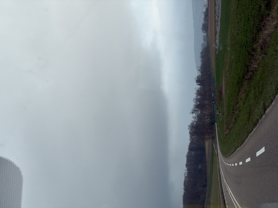 The image displays a rural landscape near Illkirch-Graffenstaden, France, under a heavily overcast, grey sky. The scene is viewed from a low perspective, likely from inside a moving vehicle, with a reflection or interior component visible in the upper-left quadrant. A two-lane asphalt road, marked with a solid white line on its left edge and dashed white lines for the center, curves sharply to the right from the lower-left foreground into the mid-ground. To the immediate left of the road is a green grassy verge, transitioning to a lower field with patches of green vegetation and exposed dark earth, bordered by a dense line of leafless deciduous trees. To the right of the road, another green grassy verge precedes a large, predominantly green agricultural field. Within this field, several pale cylindrical objects, arranged in rows, are visible towards the mid-right. A second, thinner line of leafless trees runs parallel to the road on the right, behind which a faint white vehicle is discernible. In the far background, a range of undulating hills is silhouetted against a lighter grey band of sky beneath the dominant dark cloud cover. No individuals or active interactions are present in the frame.