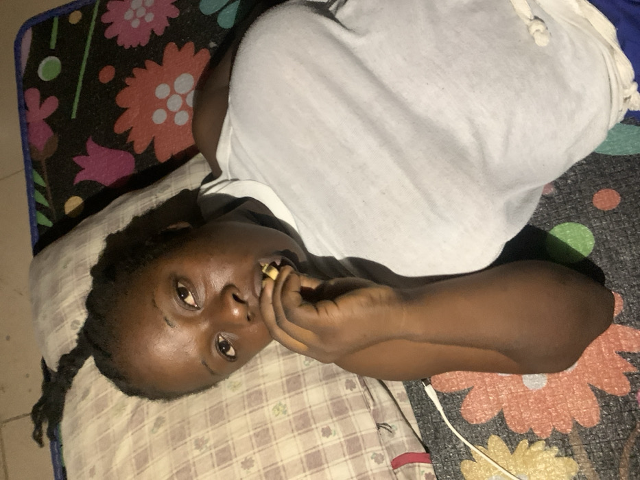 An overhead-angle indoor image taken in Akwanga, Nigeria, depicts an adult female lying on her back, angled slightly towards the camera