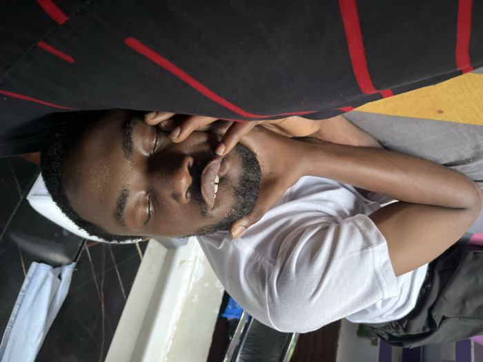 A man with dark skin and a short beard lies on his side, eyes closed, wearing a white t-shirt