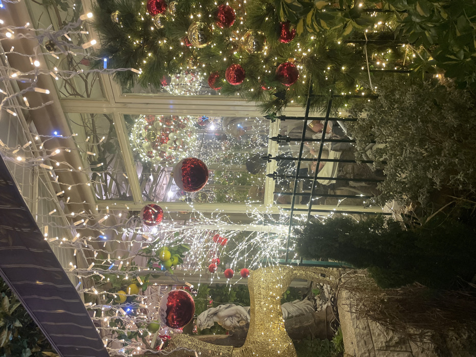 The image depicts the elaborately decorated facade of a building at night, consistent with seasonal displays found in Haifa, Israel, particularly within the Wadi Nisnas neighborhood. Above large glass windows, a striped awning is visible, from which numerous strands of white LED icicle lights are suspended. Several large, glossy red Christmas ornaments with frosted tops hang from these lights. To the left, a partially visible golden, illuminated reindeer figure is present, with a classical-style female bust statue positioned behind it. Yellow-green citrus fruits are interspersed among additional string lights. A white, illuminated "twig tree" adorned with small red baubles stands directly in front of the building's windows. Through the glass, behind a dark metal railing featuring pointed finials, indistinct figures of individuals are visible seated inside, suggesting patrons within a restaurant or cafe setting. One person's head, possibly wearing a light-colored head covering, is discernible in the lower right interior. Reflections within the window panes show further intense interior lighting and decorative elements, including a large, brightly lit spherical cluster. On the far right of the frame, an outdoor evergreen Christmas tree, extensively decorated with warm white lights, red, and gold baubles, borders the building's exterior. The foreground includes a stone wall, various green shrubs, and dried grasses.