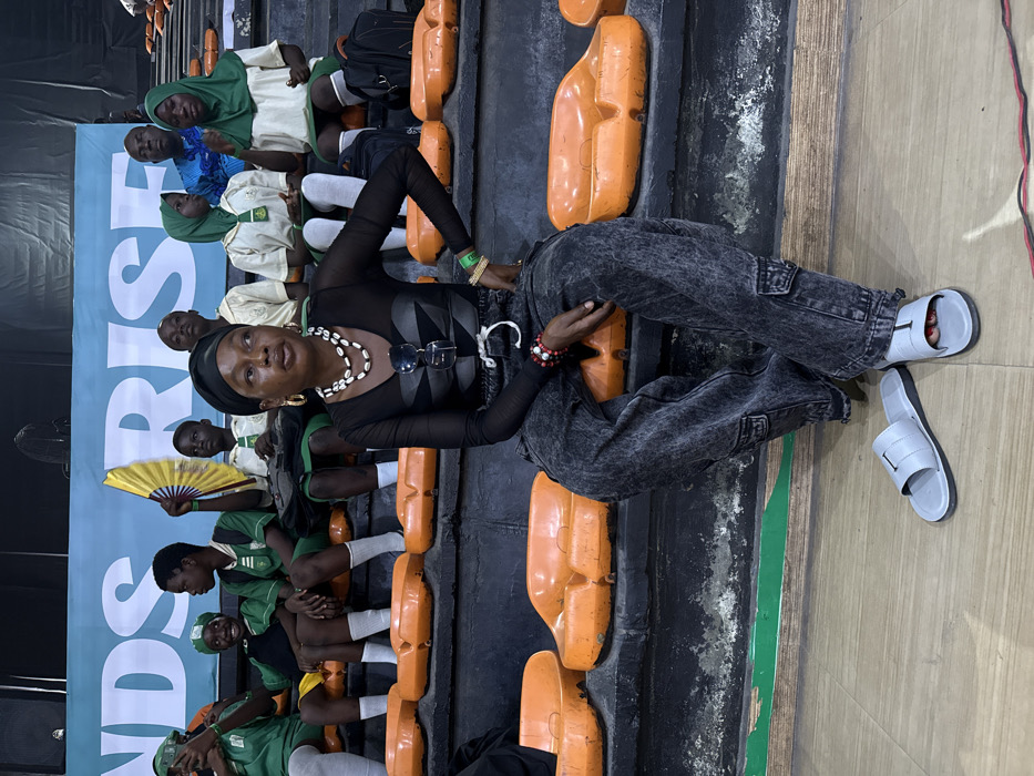 The image depicts an indoor sports or event venue in Iganmu, Nigeria, characterized by tiered seating. In the foreground, a young adult female is seated cross-legged on a light wooden floor. She wears a black headscarf, large gold hoop earrings, a multi-strand shell necklace, a black mesh long-sleeve top with an opaque geometric pattern, acid-wash wide-leg cargo jeans, and multiple bracelets on her right wrist. Sunglasses are suspended from her neckline. She is looking towards the viewer's left. Her light grey slides are positioned on the floor in front of her. Behind the foreground subject, several adolescents and one adult male are seated on orange plastic seats arranged on dark grey concrete tiers. The adolescents are primarily dressed in school uniforms: some in green shirts or tunics with dark trousers/skirts, others in cream-colored shirts with green trousers/skirts. Several female students wear green or cream hijabs. White socks are visible on many of the uniformed individuals. One adolescent on the left holds a yellow folding fan. A dark backpack rests beside a student on the right. An adult male in a blue patterned shirt is partially visible in the upper right. Above the seating, a light blue banner with white text "NDS RISE" is displayed. The overall lighting is artificial, illuminating the scene and casting subtle shadows. A black speaker or fixture is visible in the upper left corner, and a red and black cable lies on the floor in the lower right.