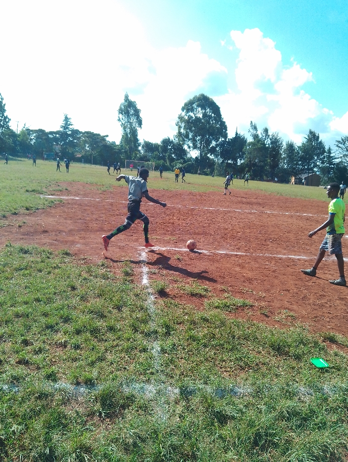 soccer game taking place on a dirt field in Rungiri, Kenya, at latitude -1