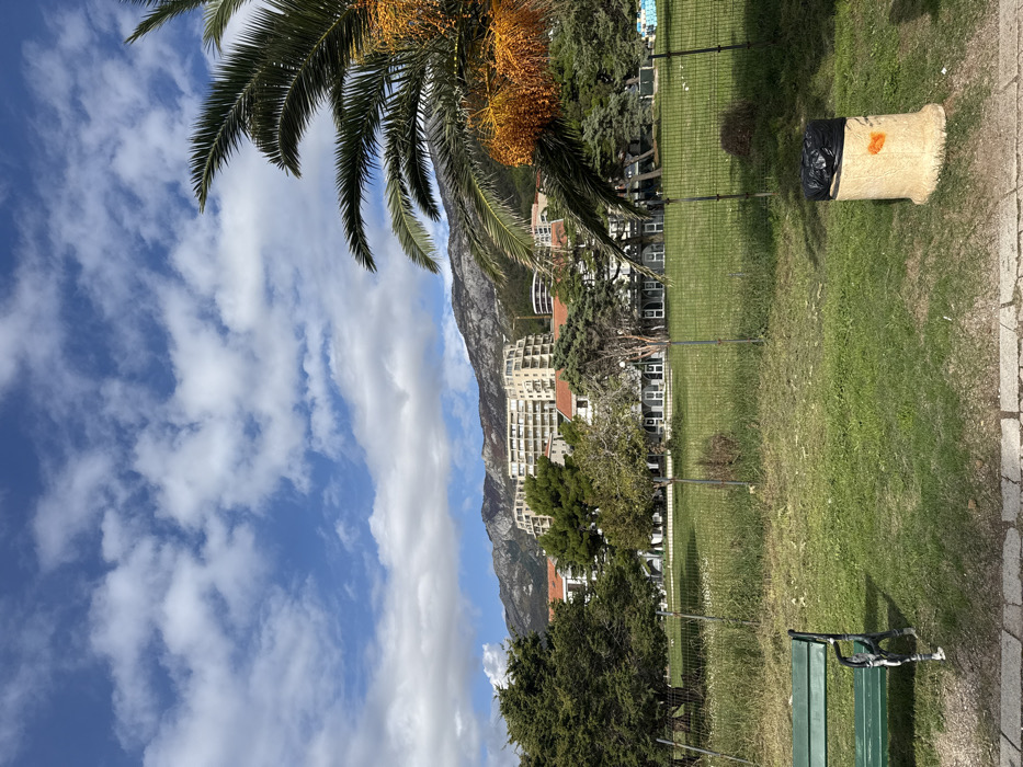 This image depicts an outdoor panoramic view in Boreti, Montenegro, under a partly cloudy sky. The foreground features a green grassy area with a paved edge along the bottom. On the left, a green park bench with a black metal frame is positioned. On the right, a light-colored, cylindrical trash receptacle with a black plastic bag and an orange mark on its side rests on the grass. A wire mesh fence with metal posts runs horizontally across the mid-ground, separating the foreground from a larger, well-maintained green lawn. Beyond this lawn, numerous trees and shrubs obscure parts of the terrain. In the background, a large, multi-story, light-colored building with multiple balconies stands prominently on a hillside, surrounded by other smaller buildings with red-tiled roofs. A rugged, gray mountain range forms the distant backdrop. The upper right corner of the image is partially framed by the dark green fronds and orange fruit clusters of a palm tree. No individuals or active subjects are present. The scene is illuminated by natural daylight.