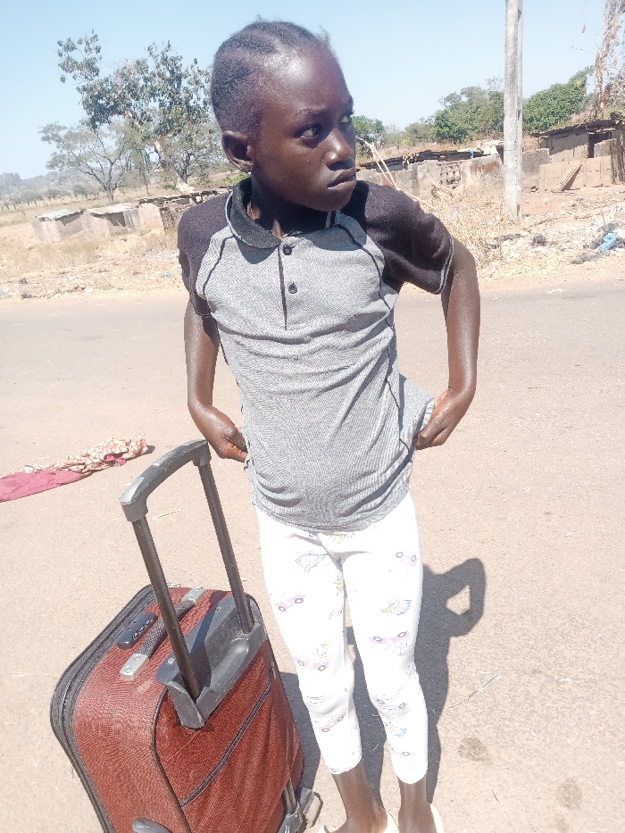An outdoor scene in Kachia, Nigeria, depicts a young individual standing on a light-colored road next to a reddish-brown rolling suitcase