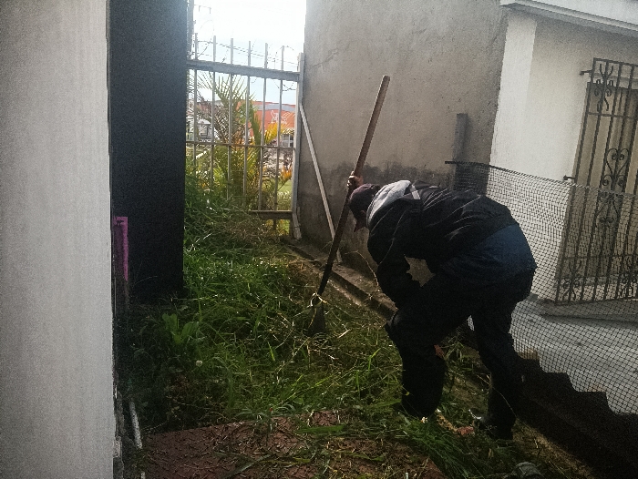The scene depicts an outdoor area in Popayán, Colombia. A single individual is visible in the mid-ground, viewed from behind and slightly to the right. The person wears a dark jacket, dark blue pants, and a dark cap, with a white collar or hood lining visible. They are bent at the waist, holding a long, light brown wooden handle of a tool, which extends towards the ground. The immediate foreground and mid-ground consist of an unpaved surface covered in dense green grass and visible soil. To the left, a light-colored wall abuts a dark, rectangular vertical structure that has a short, vertical pink marking. In the background, a light-colored metal gate stands partially open, revealing dense green foliage, including palm fronds, and the upper portions of distant buildings, one with a red-tiled roof, under a bright, potentially overcast sky. To the right, a cream-colored building wall features a dark, ornate wrought-iron security grille over a window. Below this window, a section of black mesh netting with a square pattern is attached to the wall. The ground directly beneath the netting appears to be soil and sparse vegetation.