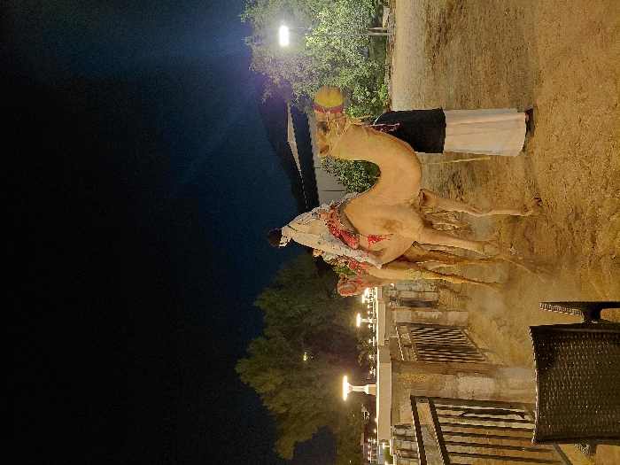 A camel decorated with red tassels stands sideways on sandy ground, near an outdoor patio with metal railings and furniture. A man in traditional attire stands next to the camel. The background features green trees and illuminated poles. The sky to the left is dark, contrasting with the brighter, sandy ground.