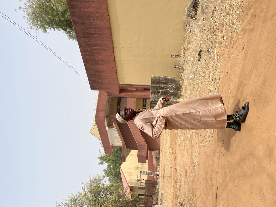 An adult male stands outdoors on a dry, reddish-brown dirt path in Kanti, Nigeria, under a clear, bright blue sky