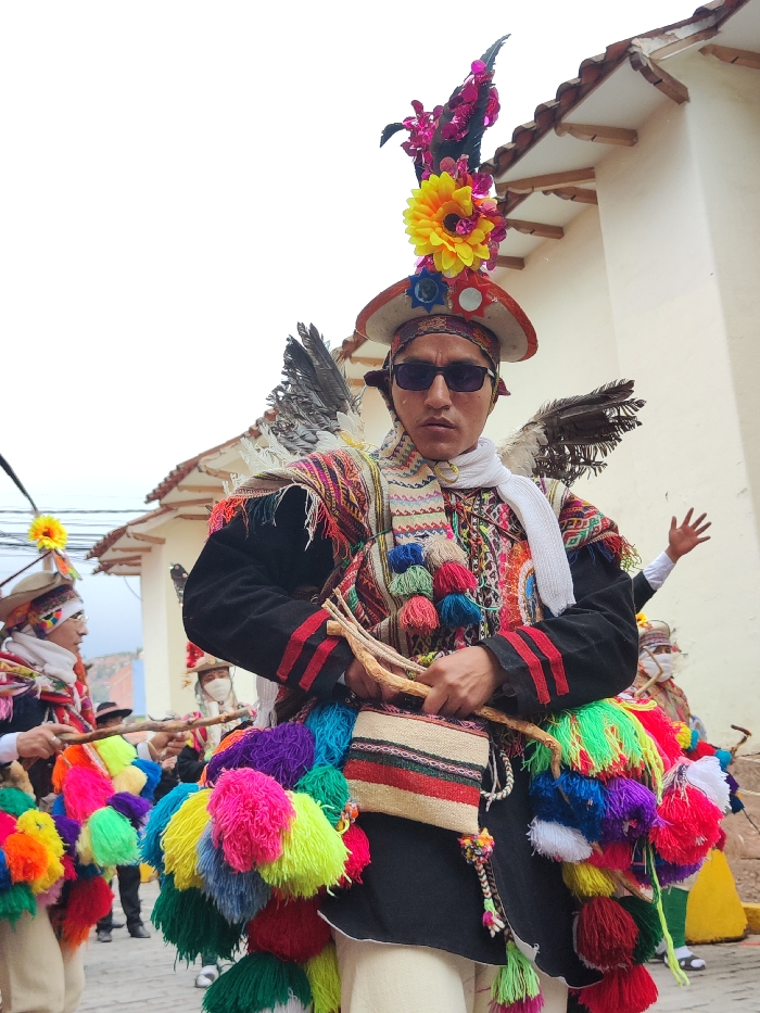 A person in vibrant traditional attire stands prominently. They wear a unique hat adorned with colorful flowers and feathers, complementing a patterned shawl. A black coat with striped trim covers a brightly woven garment. Colorful tassels hang around the waist. Sunglasses and a scarf complete the ensemble. Others in similar clothing can be seen in the background. They hold sticks and perform a cultural ceremony. The surroundings suggest an outdoor event in a rural area.