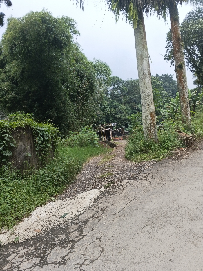 The scene depicts a rural outdoor environment in Candelaria, Philippines, under an overcast sky. In the foreground, a cracked concrete road occupies the right side, transitioning into a dirt path that branches left. This path is bordered by green grass and weeds. To the immediate left of the path stands a concrete retaining wall, partially covered in dense green vines. In the midground, along the dirt path, are visible two or three rustic, open-sided structures constructed with wooden or bamboo frames and light-colored corrugated metal roofs. White fabric items, possibly laundry, are suspended on lines near these structures. The area around these structures is densely vegetated with various green plants, including what appear to be banana trees. The background is dominated by a lush tropical forest, featuring tall bamboo clusters on the left and other dense green foliage. On the right, two tall, slender palm trees with distinctive ringed trunks rise above the general treeline. No individuals or animals are present in the image.