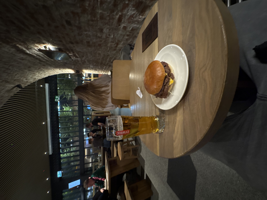 The image depicts an indoor dining scene within a restaurant or pub in Warsaw, Poland. The perspective is from a patron's view, focused on a round, light-colored wooden table in the foreground. On the table, a tall glass of Żywiec beer, approximately two-thirds full of light amber liquid, is positioned to the left. To its right, a white circular plate holds a double-patty smash burger with melted yellow cheese and a toasted bun, with white shredded ingredients visible beneath the patties. A small piece of crumpled white paper is located near the burger, and a dark, rectangular menu or placemat rests on the table's right edge. The lower portion of the image shows the legs of the person taking the photo, clad in gray trousers. The background reveals a large dining area with contrasting architectural styles. The left side features a modern ceiling composed of light wooden slats and expansive, dark-framed windows overlooking a dimly lit outdoor area with trees or foliage. Several patrons are visible in the mid-ground, seated at various wooden tables and benches. A person with long blonde hair is seated with their back to the camera, facing the windows. Other individuals are discernible further left, engaged in conversation. The right side of the interior is characterized by an arched, exposed brick and stone wall, creating a rustic contrast with the modern elements. The overall lighting is dim and ambient.