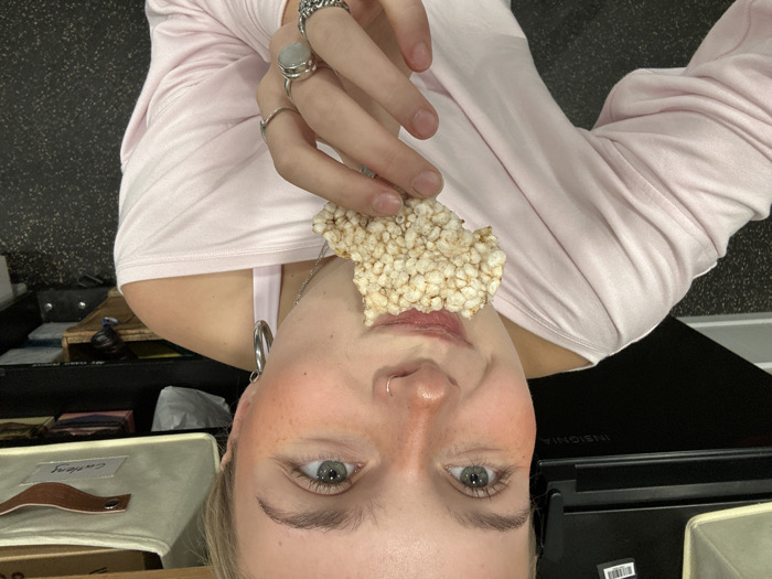 A woman is upside down, holding a puffed rice cake to her mouth. She is wearing a light pink long-sleeved shirt. Her hand, adorned with multiple rings, is visible. The background includes a drawer with a label, possibly a brand name visible on a black surface, and a dark gray floor. She has a nose ring and silver earrings. Her eyes are light-colored.