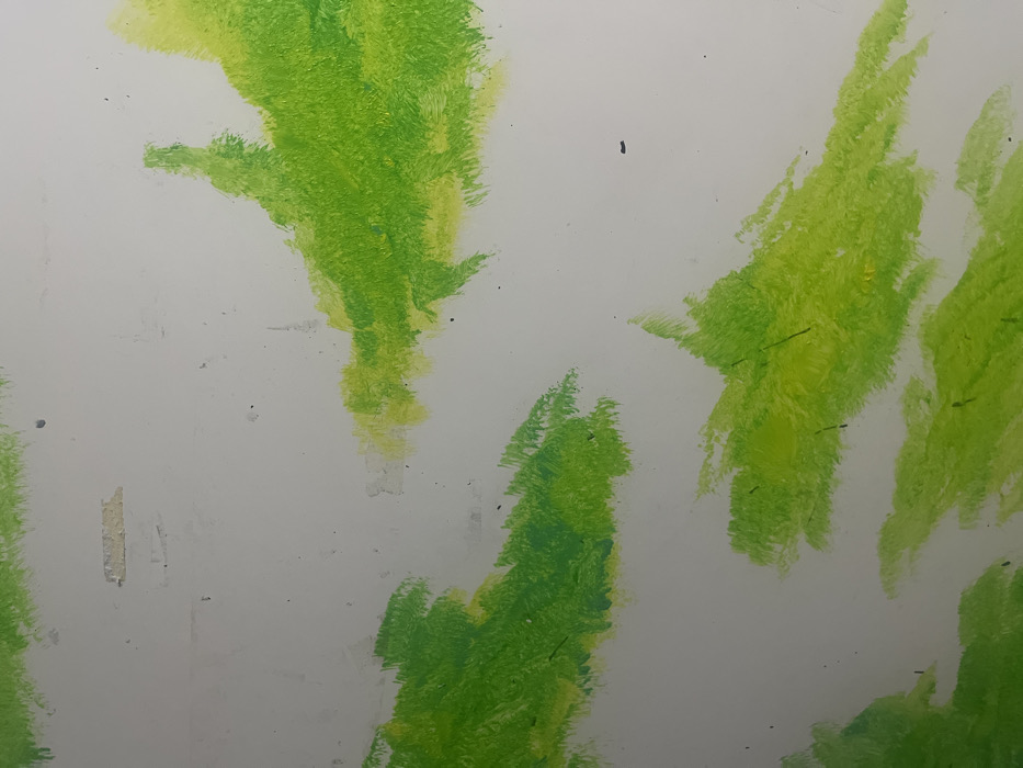 The image presents a static close-up of a light gray or off-white wall surface, located in Gosnells, Australia. Irregular, textured patches of green paint, varying from bright lime green to darker green with yellow-green elements, are applied across the surface in distinct, non-contiguous areas. Prominent paint concentrations appear in the upper left, upper right, and lower sections of the frame. The underlying wall exhibits minor surface imperfections including dark specks, faint smudges, and a small, rectangular yellowish-beige residue near the top-center. No individuals, animals, or other specific objects are present.