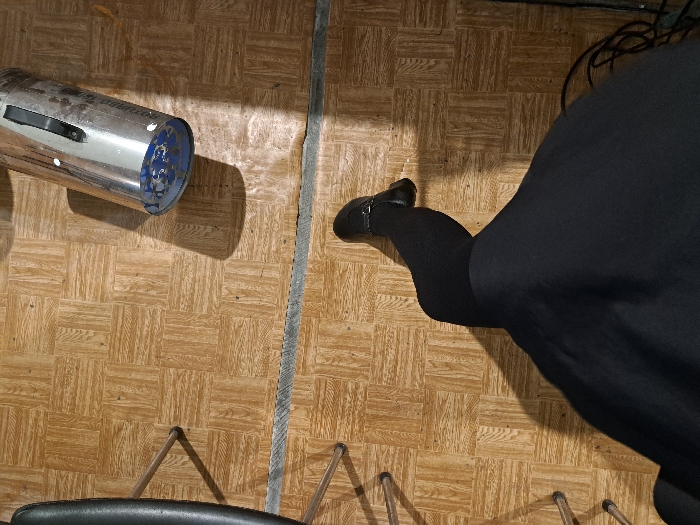 A first-person, downward-angle perspective captures a scene within a structure in Lokorsko, Bulgaria. The floor is covered with light brown square tiles featuring a wood-grain pattern. A thin, grey horizontal line traverses the floor. In the lower-left, the person's lower torso, clad in a dark skirt or dress and black tights, is visible. The right foot wears a black shoe with a strap and buckle. Partial metal legs of a dark chair are visible on the far left. In the upper-right quadrant, a cylindrical metal object, possibly a fire extinguisher, lies horizontally on the floor. It is silver-toned, bears a black handle or strap, and has a blue end cap with white markings. The object appears scuffed and dirty. Black electrical cords are present on the floor in the lower-right corner. Shadows from the cylinder and the person's leg are cast on the floor.