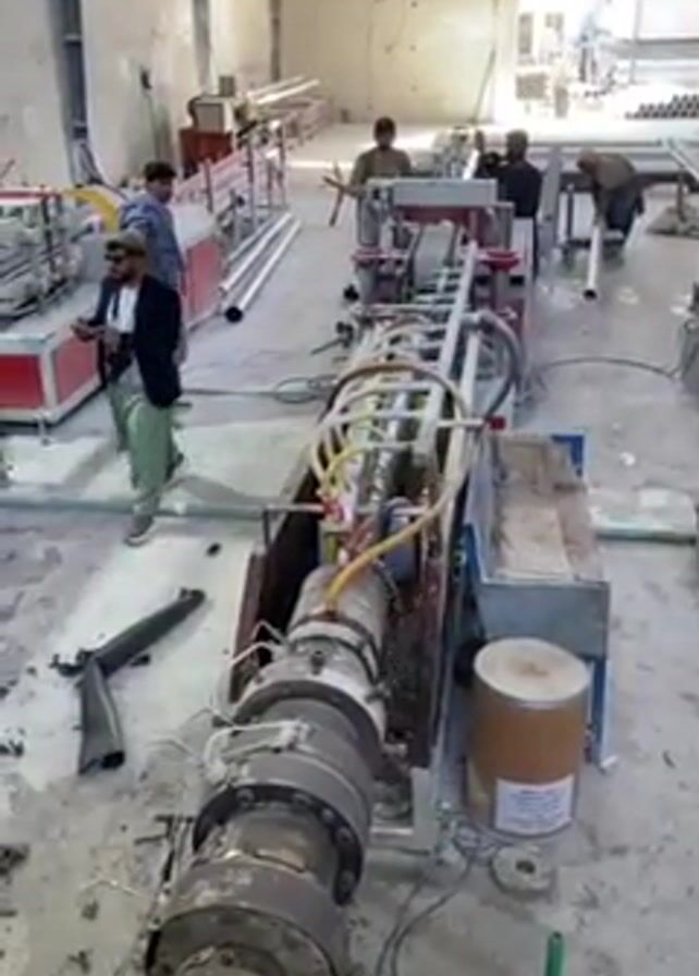 n industrial setting with several men operating machinery that appears to be involved in pipe production. One man in a suit and traditional clothing walks in the foreground, holding a cell phone. Another man appears to be adjusting a machine. There are several machines present; one long machine with multiple connected cylindrical components, connected to an extrusion process on the right, with a barrel of material near it. Other men are handling or inspecting the finished pipes at a cutting machine down the production line. A black rifle or long gun lies on the floor near the front of the primary machine in the foreground. The floor appears to be concrete and is somewhat dirty. The setting is an open building, with a doorway visible in the background.