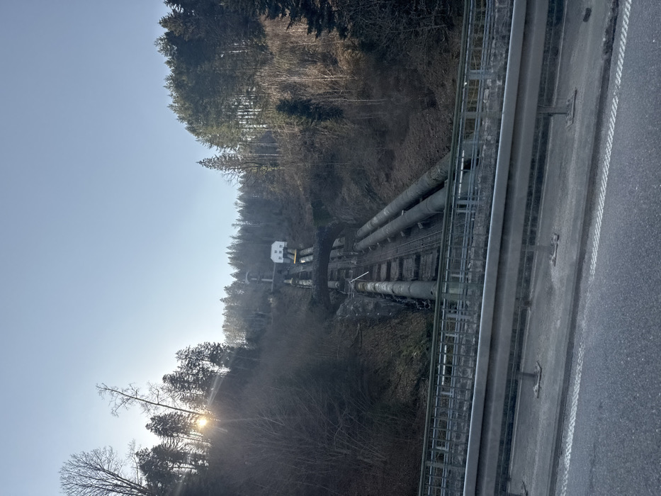 The image depicts a hillside ascending from left to right, situated in Forbach, Germany, specifically showing elements of the Murg Hydropower Plant infrastructure. In the immediate foreground, the top portion of an asphalt road surface is visible, bordered by a grey metal guardrail with horizontal and vertical supports. Beyond the guardrail, a concrete or stone bridge structure with a metal railing crosses horizontally across the lower midground. The hillside behind the bridge is densely forested, primarily with coniferous and some deciduous trees, many appearing bare or sparsely leafed, suggesting a winter or early spring season. Two prominent, large-diameter dark grey pipes, presumably penstocks, run diagonally up the steep incline from the lower left towards the upper right. Parallel to these pipes, a narrower track system, possibly a funicular or maintenance railway, also ascends the slope. Further up the hillside, approximately midway, a dark grey stone archway crosses over the ascending pipes and track. Above this archway, the pipes and track continue their ascent. A small, white, rectangular building with a dark roof is situated on the hillside to the right of the pipes. Higher up the slope and slightly to the left, another large, dark, circular or cylindrical structure, possibly a standpipe or part of a surge tank, is visible. The sky occupies the upper portion of the frame, clear and light blue. The sun is positioned in the upper left quadrant, partially obscured by tree branches, emitting a bright flare and casting direct light on the upper parts of the trees and the hillside. No individuals are present in the scene, and no overt actions or interactions are occurring. The environment is characterized by natural terrain heavily modified by industrial hydropower infrastructure.