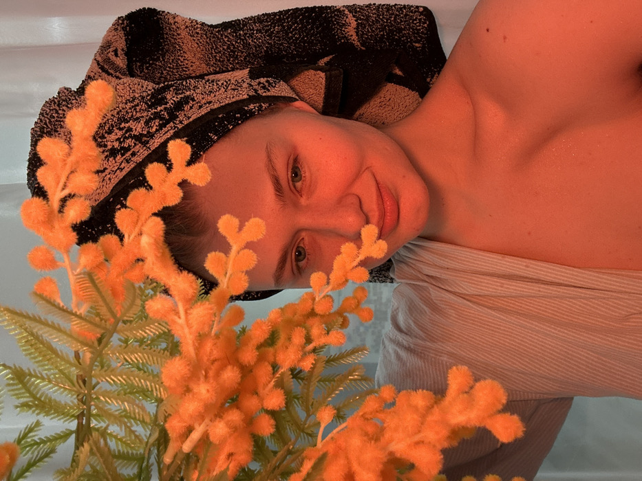 A fair-skinned female subject is depicted in a medium close-up, indoors, in Matyushino, Russia. Her head is wrapped in a dark, patterned towel. A light-colored, striped garment is draped over her left shoulder, while her right shoulder and upper chest are bare. An artificial plant with bright orange, fuzzy clusters on stems and green foliage occupies the foreground, partially obscuring the left side of the subject's face and upper body. The subject exhibits light eyes and a slight smile, looking directly towards the viewer. The scene is illuminated by a prominent orange-red light source, which casts a warm glow on her skin and the plant.