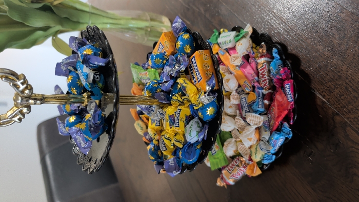 - "The image displays a three-tiered black dessert stand with scalloped edges and a gold-colored central support column, situated on a dark brown wooden table" by FM-btFon2, licensed under CC BY 4.0
