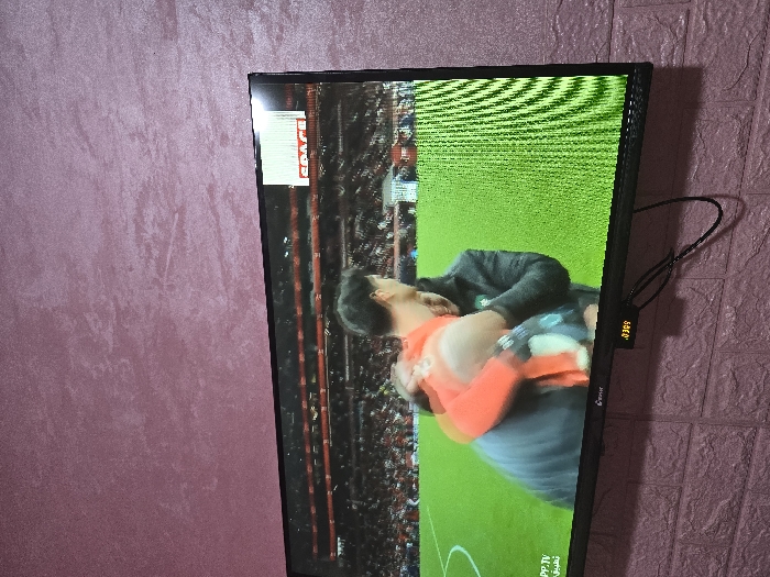 A flat-screen television is mounted on a wall. The screen displays a soccer game, with players in a close embrace on a green field. A large crowd is visible in the background. A sticker is on the top left of the screen. A black cable is connected to the TV's right side. The wall behind the TV is textured.