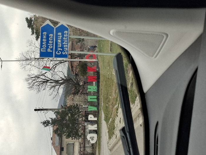 The image presents a street-level view from inside a vehicle, looking out through the windshield towards the entrance or a prominent intersection within the town of Krupnik, Bulgaria, on an overcast day