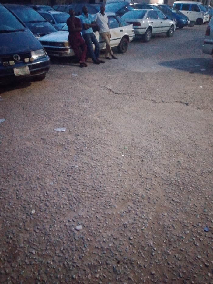 A parking lot contains several vehicles, including a dark-colored van in the foreground, and rows of cars behind it. Three men stand near the vehicles. The man on the left wears a maroon outfit, the man in the middle wears a light blue shirt and jeans, and the man on the right wears a white shirt and tan pants. The ground is uneven and stony. The image's lighting appears dim.