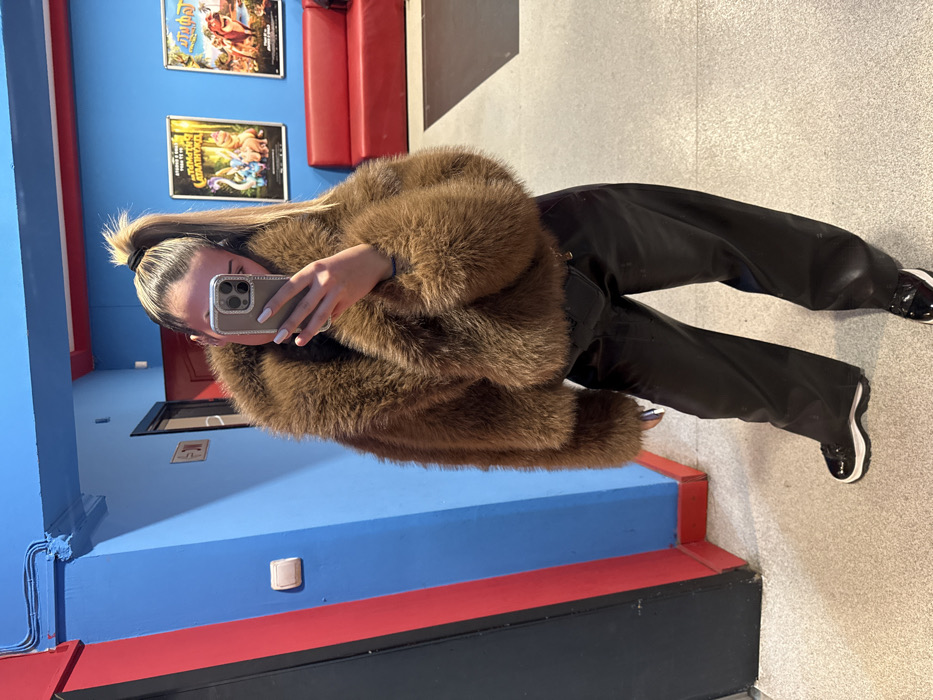 A female subject stands indoors, taking a mirror selfie within what appears to be a cinema lobby or waiting area in Plovdiv, Bulgaria. She is dressed in a voluminous brown fur coat, dark wide-leg trousers, and black patent leather shoes with white soles. Her blonde hair is pulled back into a high ponytail. The subject holds a smartphone with a clear, embellished case in front of her face, partially obscuring it. A small black fanny pack is visible around her waist. The background features a vibrant blue wall, a vertical red stripe along the left, and a darker vertical section. Two framed movie posters for animated films, identified as "The Croods: A New Age" and "The Good Dinosaur," are mounted on the blue wall to the right. A long, red upholstered bench or sofa is positioned below the posters. A black door with a white "K" symbol is partially visible on the left, adjacent to a white light switch. The floor is light-colored, possibly gray or beige, and exposed conduits run along the top of the blue wall.