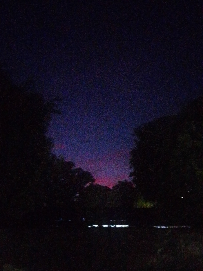 The image displays an outdoor scene at twilight, depicted as occurring in Juan Griego, Venezuela. The sky transitions from a deep indigo at the top to a distinct horizontal band of fuchsia and magenta hues towards the horizon, indicating the final stages of a sunset or early nightfall. Dark, amorphous masses of dense foliage and tree canopies form prominent silhouettes along the left and right edges, framing the colorful sky and extending into the indistinguishable dark foreground. In the distant midground, below the illuminated horizon, several faint, horizontally oriented white light sources are visible. These lights appear to be artificial, potentially reflecting off a body of water or originating from distant structures or vehicles. No individuals or specific identifiable man-made structures are present in clear detail. The overall image exhibits significant grain, consistent with low-light photography.