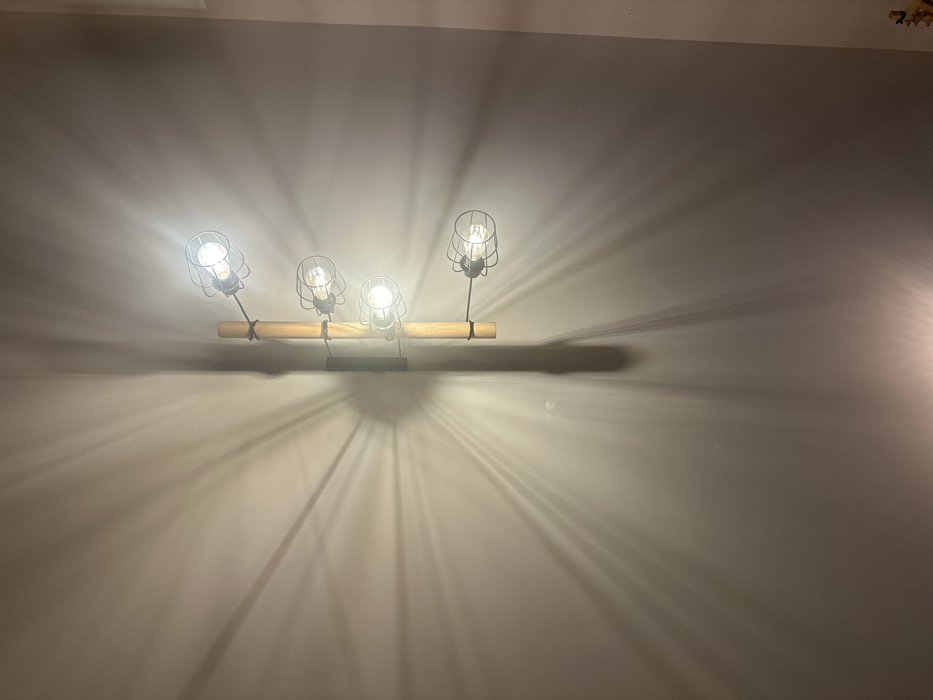 This image depicts an indoor scene, described as being located in Sofia, Bulgaria. A vertical, wall-mounted light fixture is centered within the frame against a plain, light-colored wall. The fixture comprises a light-toned wooden beam to which four individual light sources are attached. Each light source features a clear or frosted bulb enclosed within a dark-colored, industrial-style metal cage. All four bulbs are illuminated, casting bright, radial shadows of their respective cages and connecting hardware onto the surrounding wall. These shadows form distinct sunburst patterns emanating from each light point. An elongated shadow of the central wooden beam is visible to the left. No individuals or additional objects are present in the visible environment.