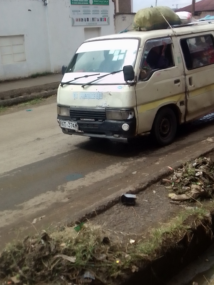 A worn, light-colored van, possibly a passenger vehicle, sits on a street. It has luggage on the roof, and "2G PRESTIGE LTD" is visible on the front. The license plate reads "KAT 374M". The street is damaged and possibly wet, with debris and trash scattered along the edge. A building with a sign is visible in the background.