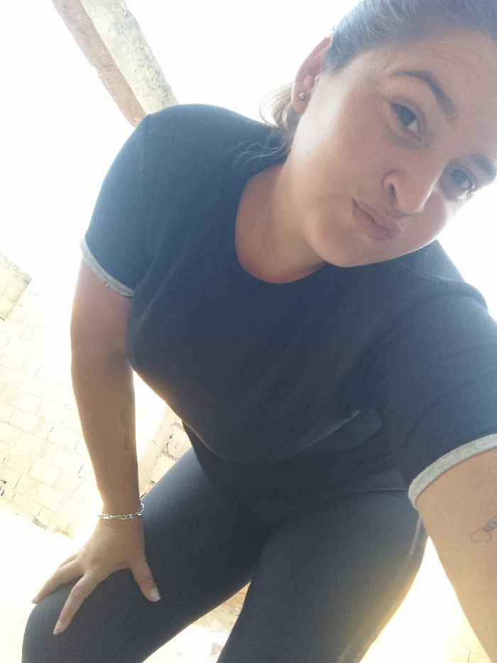 A female subject is depicted in a low-angle, head-and-torso shot, positioned in an outdoor or semi-enclosed area within the city of Altagracia, Venezuela. The subject, a woman with dark hair pulled back, directly faces the camera with pursed lips forming a "kissing" gesture. Her right ear features a small, spherical stud earring. She wears a dark-colored short-sleeved t-shirt with light grey trim on the sleeves and dark-colored leggings. A silver-toned chain link bracelet is present on her left wrist. Her left hand rests on her bent left knee or upper thigh. A faint, dark marking or tattoo is visible on her inner right bicep/forearm area. The background consists of light-colored, block-like construction or masonry walls, illuminated by bright, diffused light from above and behind the subject.