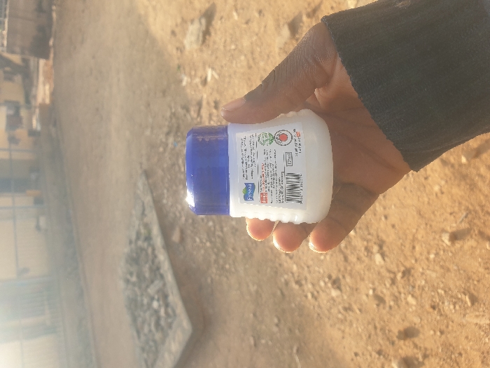 A close-up, eye-level outdoor photograph, taken in Rafin Par, Nigeria, shows a dark-skinned right hand holding a white, ribbed plastic bottle with a blue screw-top cap