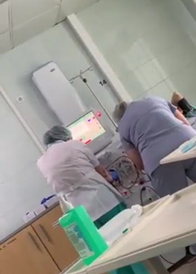 Two medical staff members are attending to a patient receiving medical treatment from a dialysis machine in a medical facility