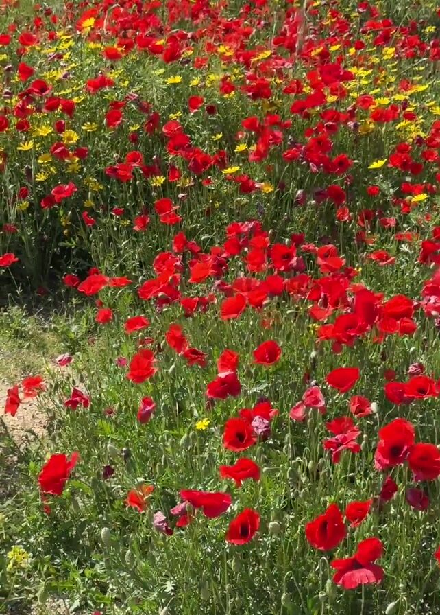 vibrant field of wildflowers. Red poppy flowers dominate the foreground, mixed with smaller yellow flowers. Green grass and stems fill the spaces between the flowers. A bare dirt path cuts through the field. In the background, more yellow flowers extend, eventually meeting a green grassy area and the horizon, with a few buildings visible in the distance under a bright sky. The camera slowly zooms out to get a wider view of the field.