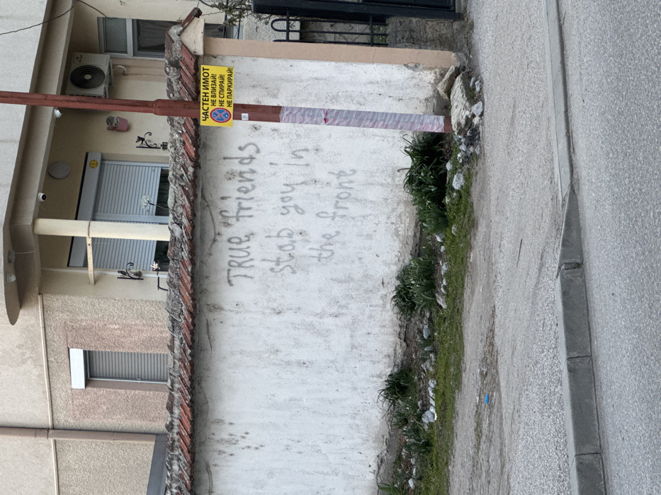 The scene depicts a weathered white stucco wall in Vidin, Bulgaria, topped with reddish-brown roof tiles. Graffiti in gray paint across the center of the wall reads: "TRUE friends stab you in the front". A red utility pole is affixed to the right side of the wall, featuring a yellow rectangular sign with a red "No Stopping" symbol. The sign's Cyrillic text translates to "PRIVATE PROPERTY! DO NOT ENTER! DO NOT STOP! DO NOT PARK!". Behind the wall, a multi-story residential building with a light beige facade is visible, featuring multiple windows with closed roller shutters, a balcony, an external air conditioning unit, and two surveillance cameras. At the base of the wall, a strip of ground contains sparse green grass, small rocks, and exposed dirt. In the foreground, a gray paved area, with a small blue plastic object, leads to an asphalt street separated by a concrete curb. No individuals are present, and no active interactions or specific actions are observed.