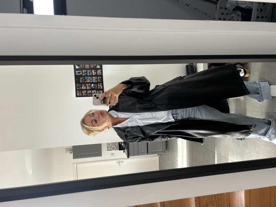 A female subject is depicted taking a mirror selfie in an interior setting, identified as a residence in Chambœuf, France. The subject is a blonde woman wearing gold-framed glasses and gold hoop earrings. Her hair is styled away from her face. She is dressed in a light blue collared shirt, a long black trench coat, and light blue wide-leg jeans with cuffed hems. White socks are visible, along with a dark-colored sneaker with a white midsole and gum outsole on her right foot. She holds a light-colored smartphone with a black pop socket on the back, capturing her reflection. A ring is visible on her right ring finger. The background, reflected in the mirror, shows a domestic environment. To the left, wooden stairs are partially visible. A kitchen or utility area is present, featuring grey upper and lower cabinets, a black countertop, a white door, and black and white patterned backsplash tiles. A small clear glass object rests on a shelf or cabinet. On the wall to the right of the subject, a black framed collage of small photographs is mounted. Further right, a white piece of furniture with a dark object on it is visible, along with a white laundry basket containing dark fabric. The flooring appears to be a light, reflective surface. The walls are white.