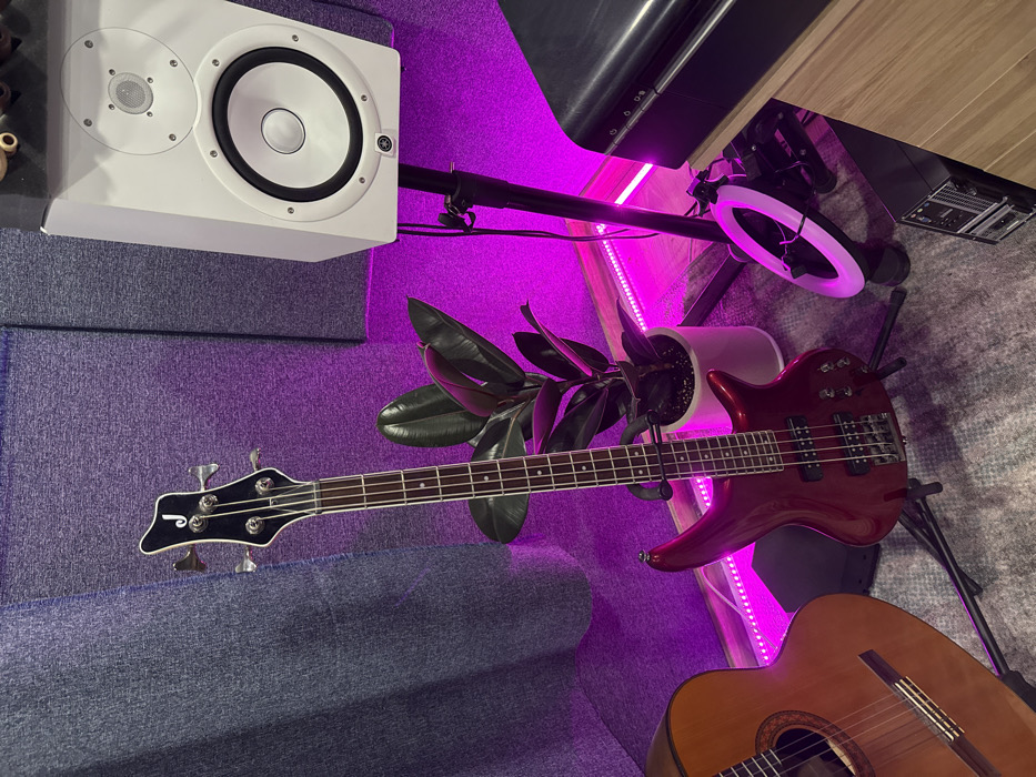 A musical space presents a white studio monitor speaker positioned above blue acoustic panels. A rubber plant in a white pot sits nearby. A red bass guitar on a stand lies adjacent to a classical acoustic guitar. Overhead, a ring light illuminates the scene with a purple hue. The backdrop is a blend of gray carpeting and a wooden surface with electronic equipment.