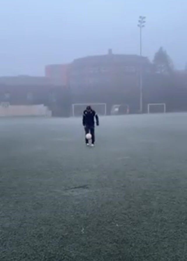 A young person juggles a soccer ball in the middle of a field. The person is wearing a black athletic outfit. They stand alone in the middle of the field, kicking the ball with their feet and legs in a rhythmic motion. Behind them in the distance are soccer goals, a small building, and a tall building. Tall lights stand behind the building. The field is green and partially covered with frost. A layer of heavy fog covers the entire background and part of the field.