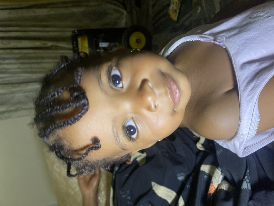 A young Black girl with braided hair and bright eyes looks at the camera. She has a neutral expression with a slight smile. She is wearing a light-colored tank top with lace trim and a gold earring. The background includes patterned bedding and a glimpse of a machine or equipment with a yellow wheel. The image is taken from a close-up angle.