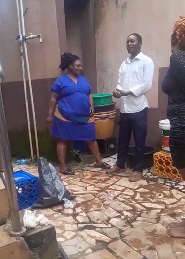 three people in an outdoor area. A woman in a blue dress is talking and gesturing to a man in a white shirt and dark pants. Another woman, wearing a black dress, stands to the right. The area is paved with cracked tiles and contains various objects including blue crates, a trash bag, buckets, and a paint can. A water tank is visible on top of the building. The interaction between the woman in blue and the man appears to be a conversation.