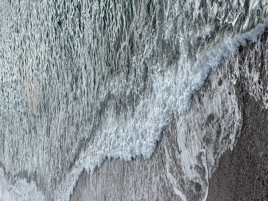 An aerial view showcases a dynamic ocean scene. Turbulent, dark waves cascade onto a pebble beach. White foam crests and spreads, contrasting with the darker water and shore. Linear patterns are evident in the wave direction, highlighting the movement and texture of the water. The visual effect is a blend of power and serenity.