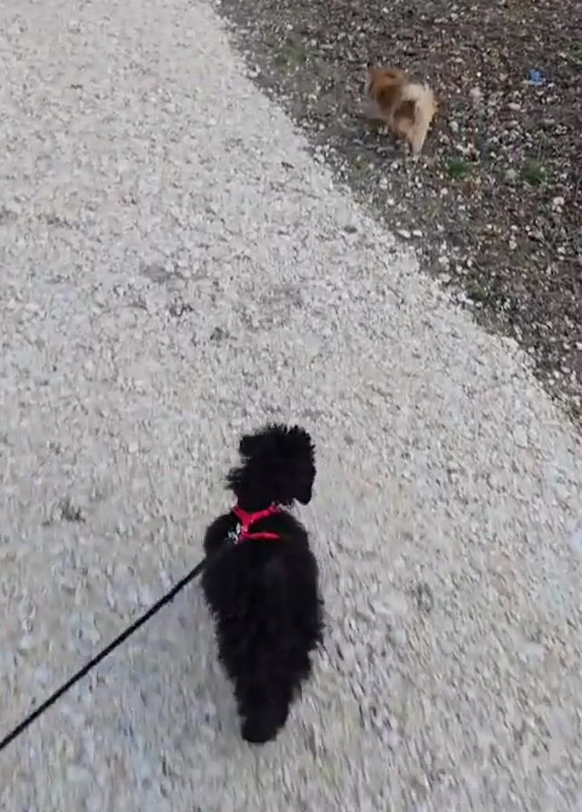 A small, black, curly-haired dog with a red harness walks along a gravel path on a leash held by someone filming