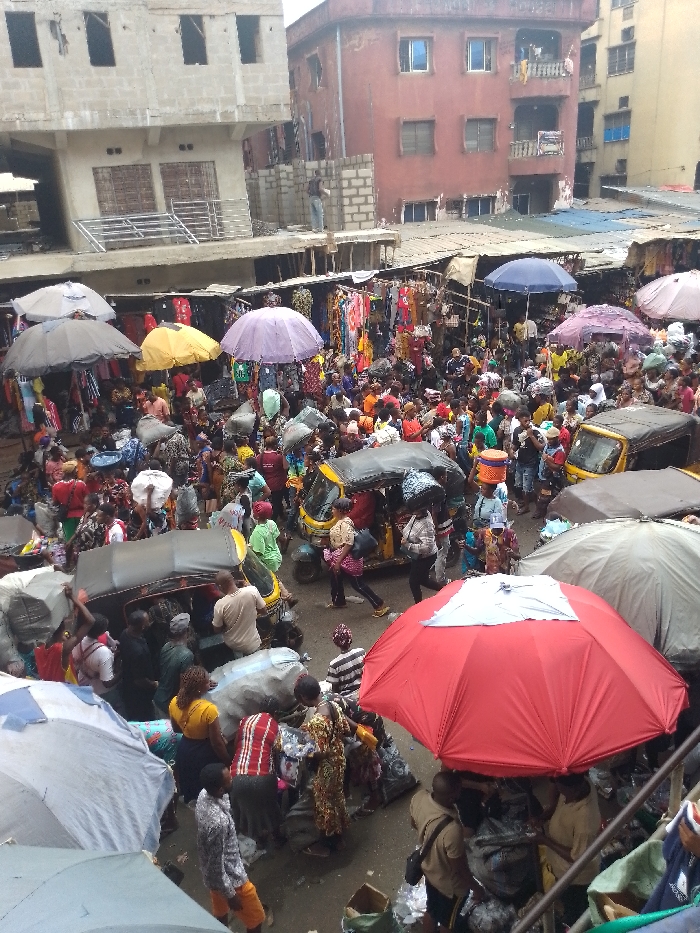 The image displays a bustling outdoor market scene in an urban area. In the background, a multi-story, unfinished concrete building with exposed blockwork stands to the left, while a reddish-brown, multi-story building with multiple windows and balconies is positioned on the right. The market area is densely populated with hundreds of individuals, predominantly adults, navigating through numerous makeshift stalls. Many individuals are walking, some carrying goods on their heads or in large bundles. Numerous large, open umbrellas in various colors (grey, yellow, purple, blue, red) are interspersed throughout the market, providing cover for stalls and people. Merchandise, primarily clothing and textiles, is openly displayed on racks, tables, and ground coverings. Multiple motorized tricycles, consistent with public transport or goods delivery vehicles, are observed within the crowd, either stationary or moving slowly. The ground appears worn from foot traffic. The sky above is overcast.