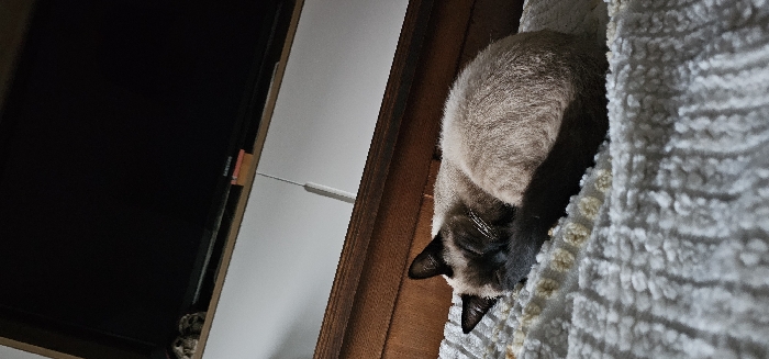 An indoor scene, located in Esch-sur-Alzette, Luxembourg, depicts a Siamese-type cat sleeping