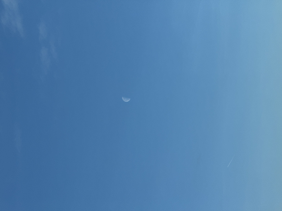 A bright blue sky dominates the scene. A thin crescent moon sits slightly off-center towards the top of the frame. Faint wisps of clouds are visible in the upper left. In the bottom right, a subtle white trail, possibly a contrail from an airplane, stretches diagonally. The sky's hue deepens slightly from left to right.
