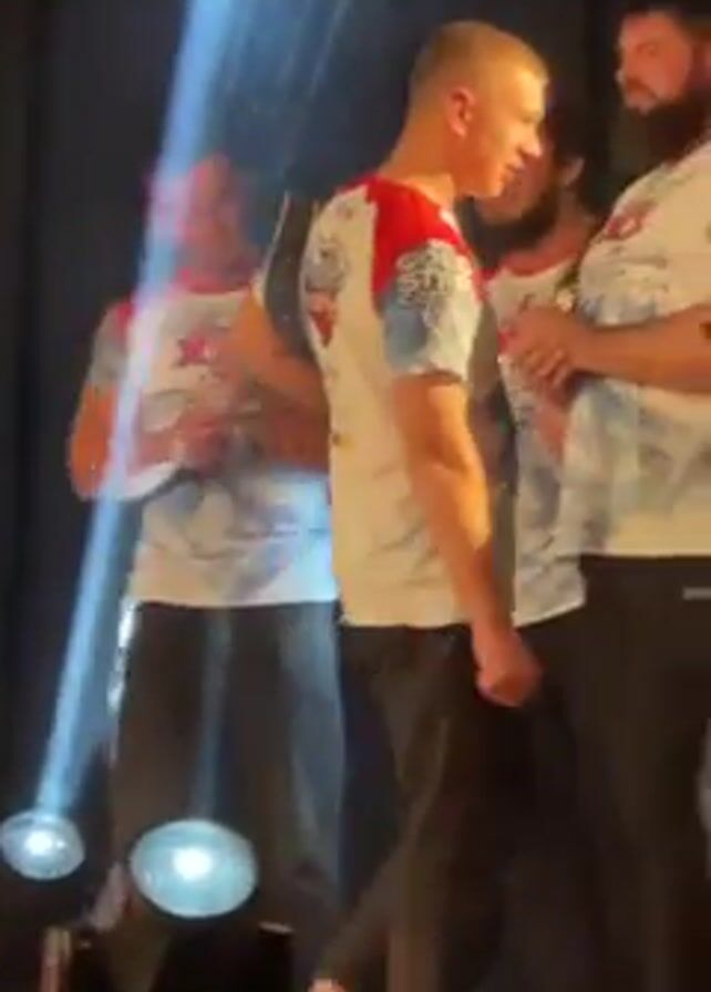A group of people, wearing matching white shirts with red and blue designs, is standing on a stage. A man in jeans is holding a microphone, looking down, and speaking. There are stage lights. One person in the group is a woman with her hair pulled back.