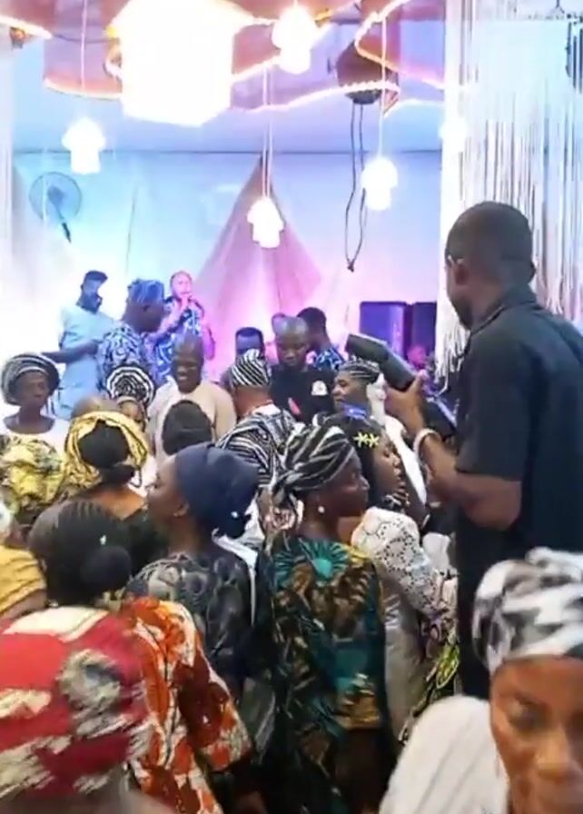 crowd of people dancing and celebrating in a large room. Most of the people in the crowd are women, many of whom are wearing traditional African head wraps and colorful patterned clothing. There are also a few men in the crowd, some wearing traditional outfits and others in more casual attire. In the background, there is a stage with a band playing music. The room is decorated with lights and streamers, and there is a celebratory atmosphere. A man in a black shirt is standing near the front of the crowd, recording the event with a camera.